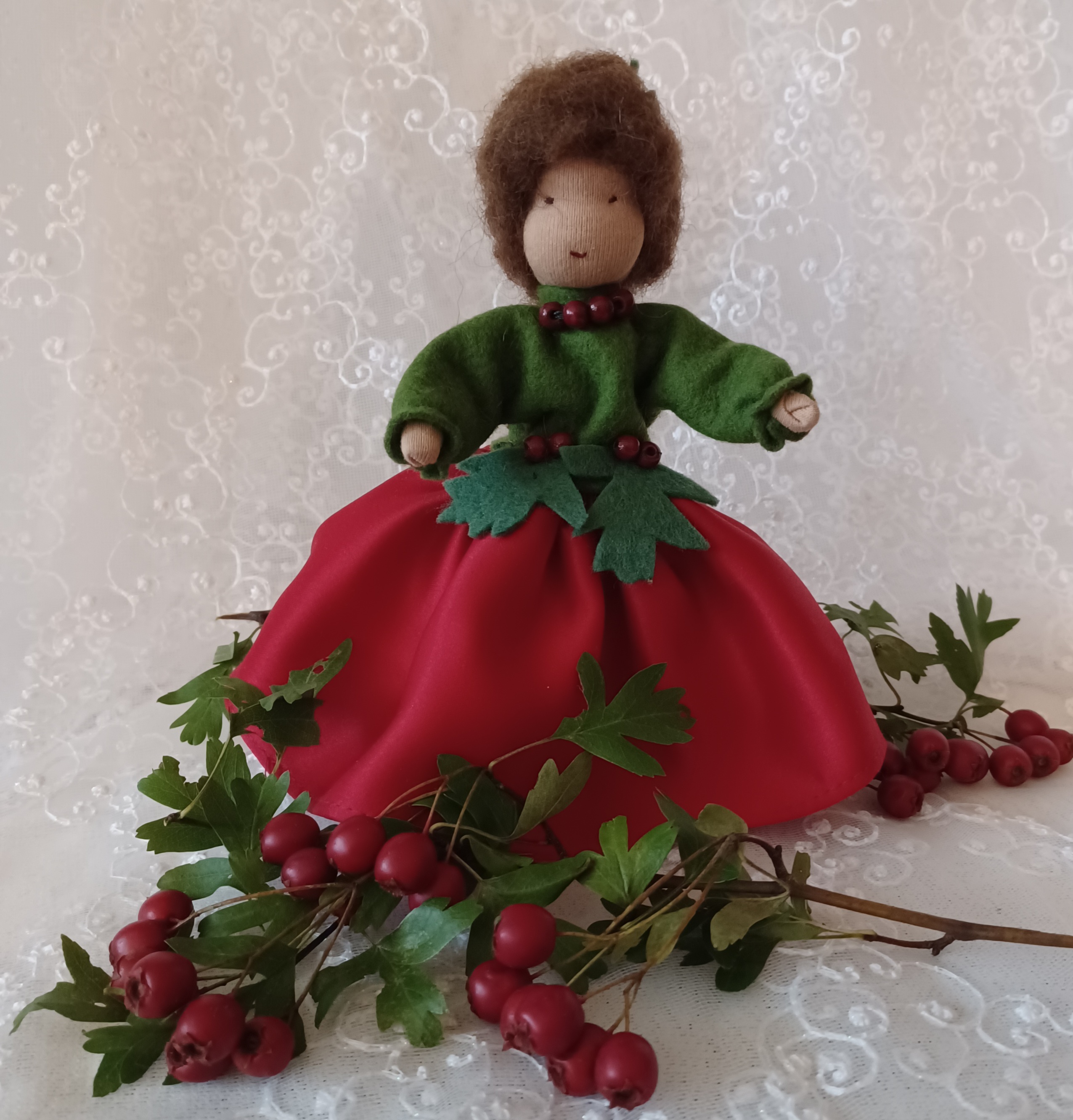 Powstała na pożegnanie lata. Inspirowana po trochu lalkami waldorfskimi, po trochę laleczkami po niemiecku zwanymi Biegepüppchen. Metalowy stelaż sprawia, że ręce i nogi są ruchome. Sukienka z recyklingu czyli z dziecięcych ubranek, które nie nadawały się już np. do podarowania komuś, ale ich skrawki idealnie przydały się na ubranka lalek:)